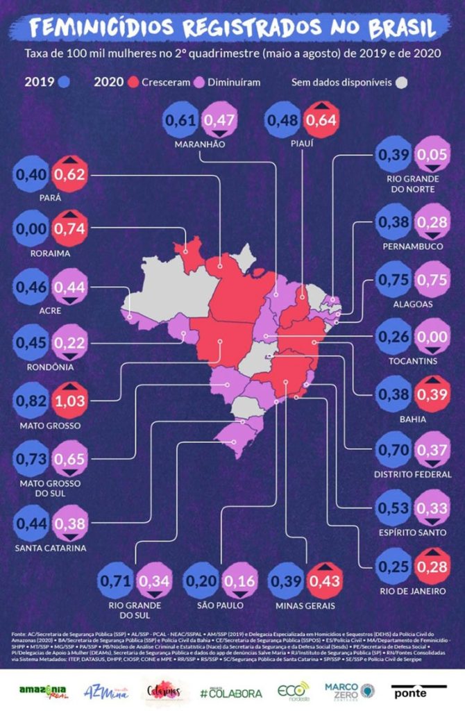 Doze estados registraram queda do números absolutos de feminicídios entre março e agosto, representando uma redução de 23% em relação ao mesmo período de 2019. Rio Grande do Sul e Distrito Federal foram os que mais contribuíram com a diminuição. Por outro lado, em sete estados houve aumento de 23% (38 mortes) em relação ao mesmo período do ano anterior. Pará e Mato Grosso encabeçam o aumento: 15 e 10 mortes respectivamente.