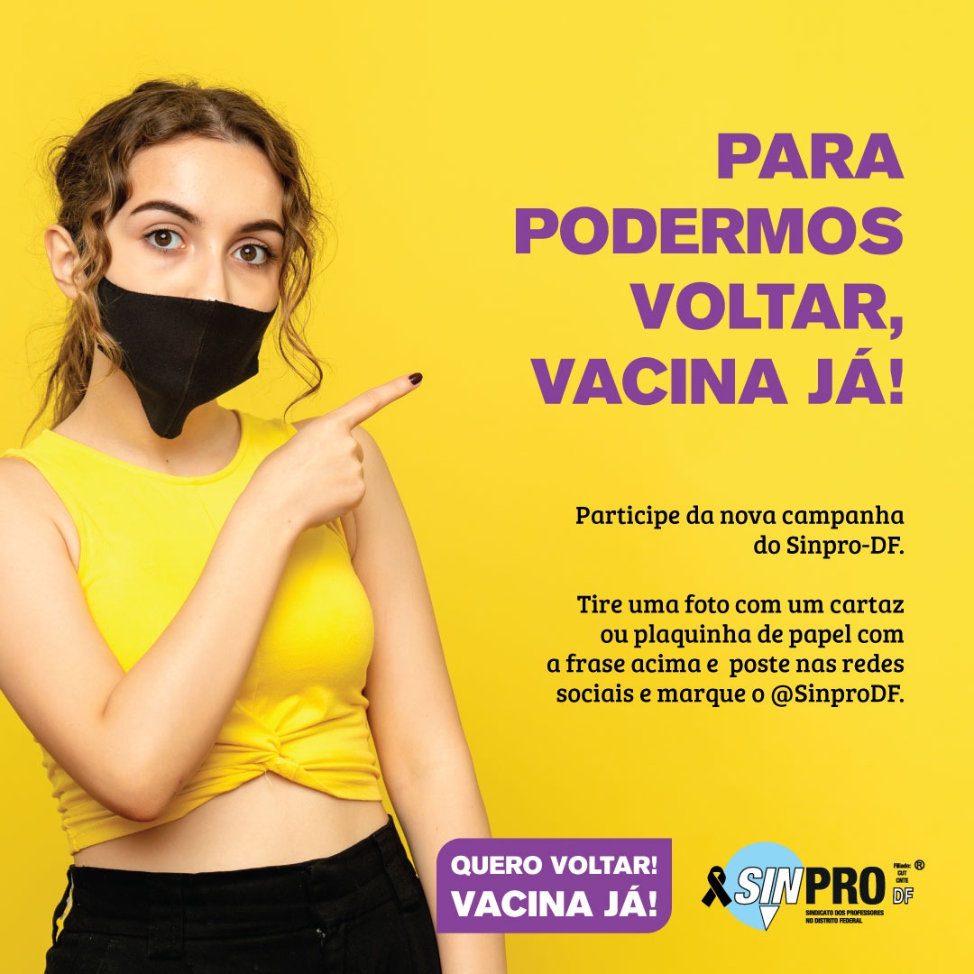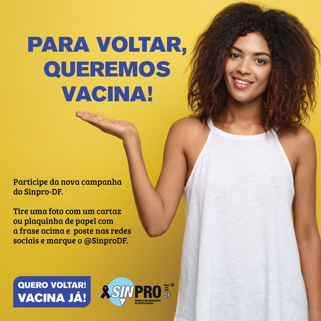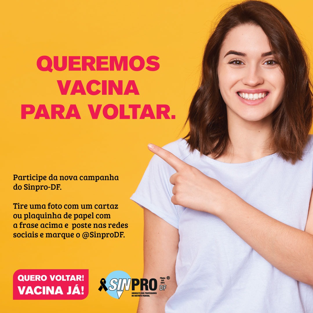 O Sinpro-DF convoca a categoria para participar da nova etapa da campanha Sem vacina não dá pra voltar! A ideia é a de que todos(as) os(as) professores(as), orientadores(as) educacionais e estudantes tirem fotos com uma plaquinha na qual esteja escrito uma das seguintes frases: PARA VOLTAR, QUEREMOS VACINA!; PARA PODERMOS VOLTAR, VACINA JÁ! e QUEREMOS VACINA PARA VOLTAR! Para fortalecer a campanha você também pode mudar seu avatar no Facebook e compartilhar com seus colegas.