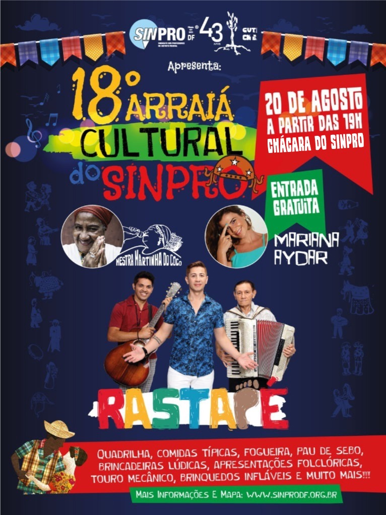 Convide seus colegas e familiares: o 18º Arraiá do Sinpro dia 20 de agosto será inesquecível! Fique ligado e ligada nas redes e no site do Sinpro, que em breve novas informações serão divulgadas.