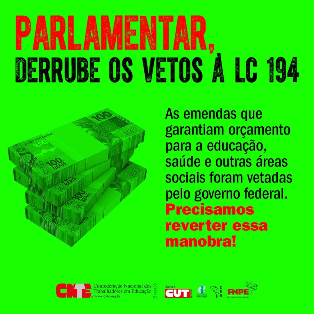 “Diante de mais esse ataque do governo federal contra a educação e a saúde públicas, a CNTE convoca sua base social para pressionar os parlamentares (deputados e senadores) a pautarem com urgência a derrubada dos nove vetos à LC 194, sobretudo os relativos às áreas sociais. Não podemos permitir que mais esse golpe contra maioria do povo brasileiro se concretize”, diz trecho da nota da CNTE.