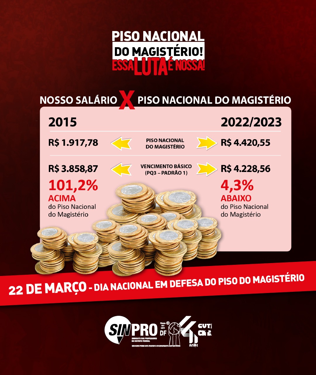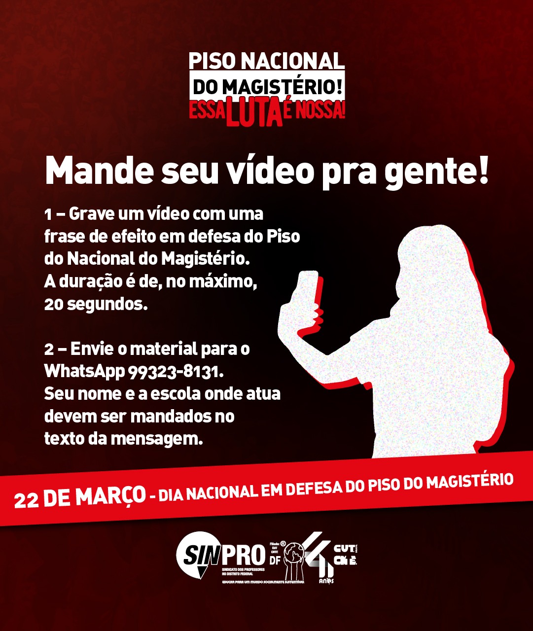 Como parte das ações deste 22 de março, Dia de Mobilização em defesa do Piso Nacional do Magistério, o Sinpro-DF lançou a atividade “Some na luta em defesa do piso e de nossa recomposição salarial”. Para participar, grave um vídeo de até 20 segundos dizendo por que você defende a carreira do magistério público, a reestruturação da carreira do magistério distrital e o Piso Nacional da categoria. Envie o material para o whatsapp 99323-8131, informando também seu nome e a escola onde você atua.
