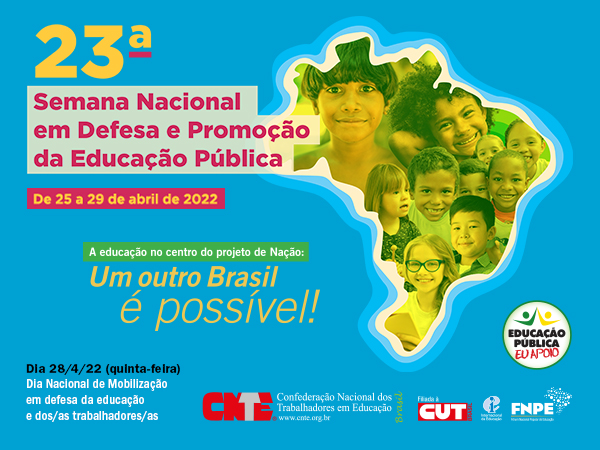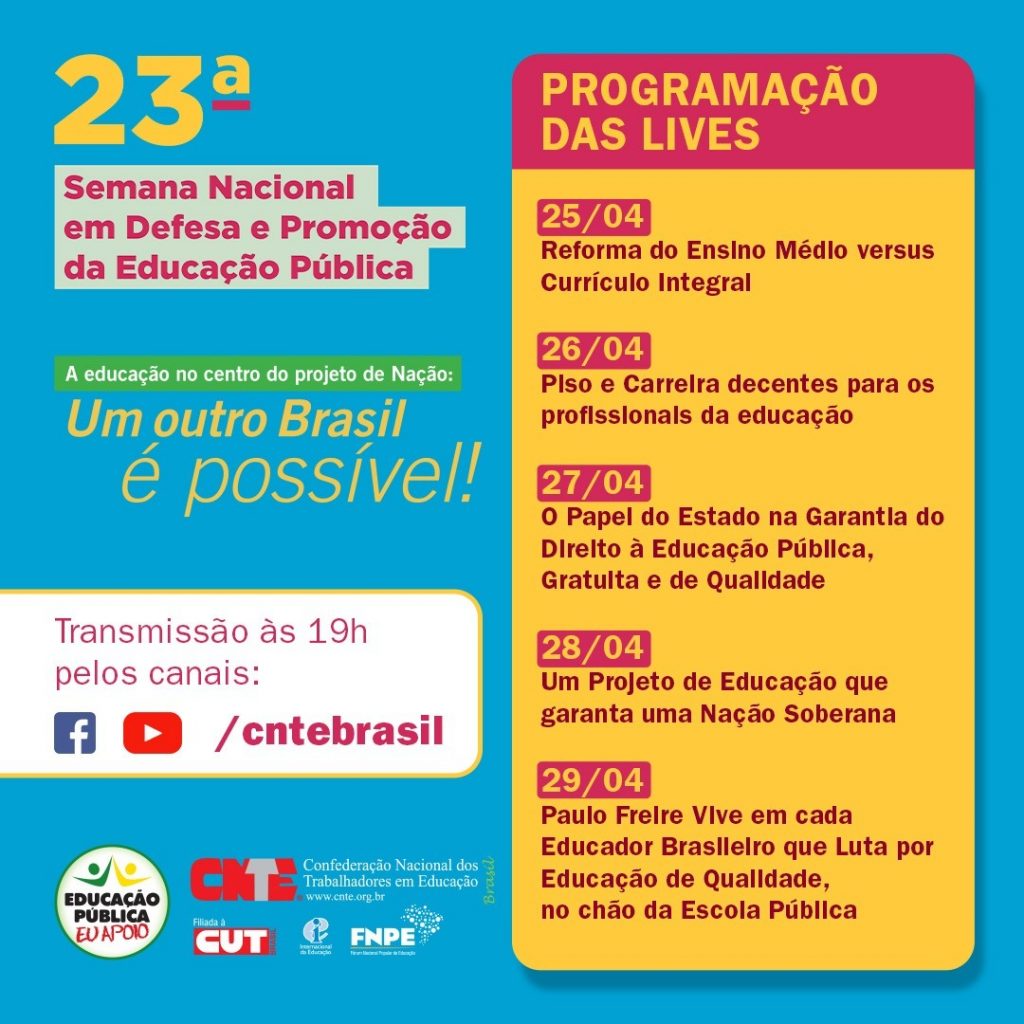 Começa nesta segunda-feira (25) a 23ª edição da Semana Nacional em Defesa e Promoção da Educação Pública, que conta com uma programação formada por atividades diárias até o dia 29 de abril. As lives serão transmitidas pela página da CNTE no Youtube.