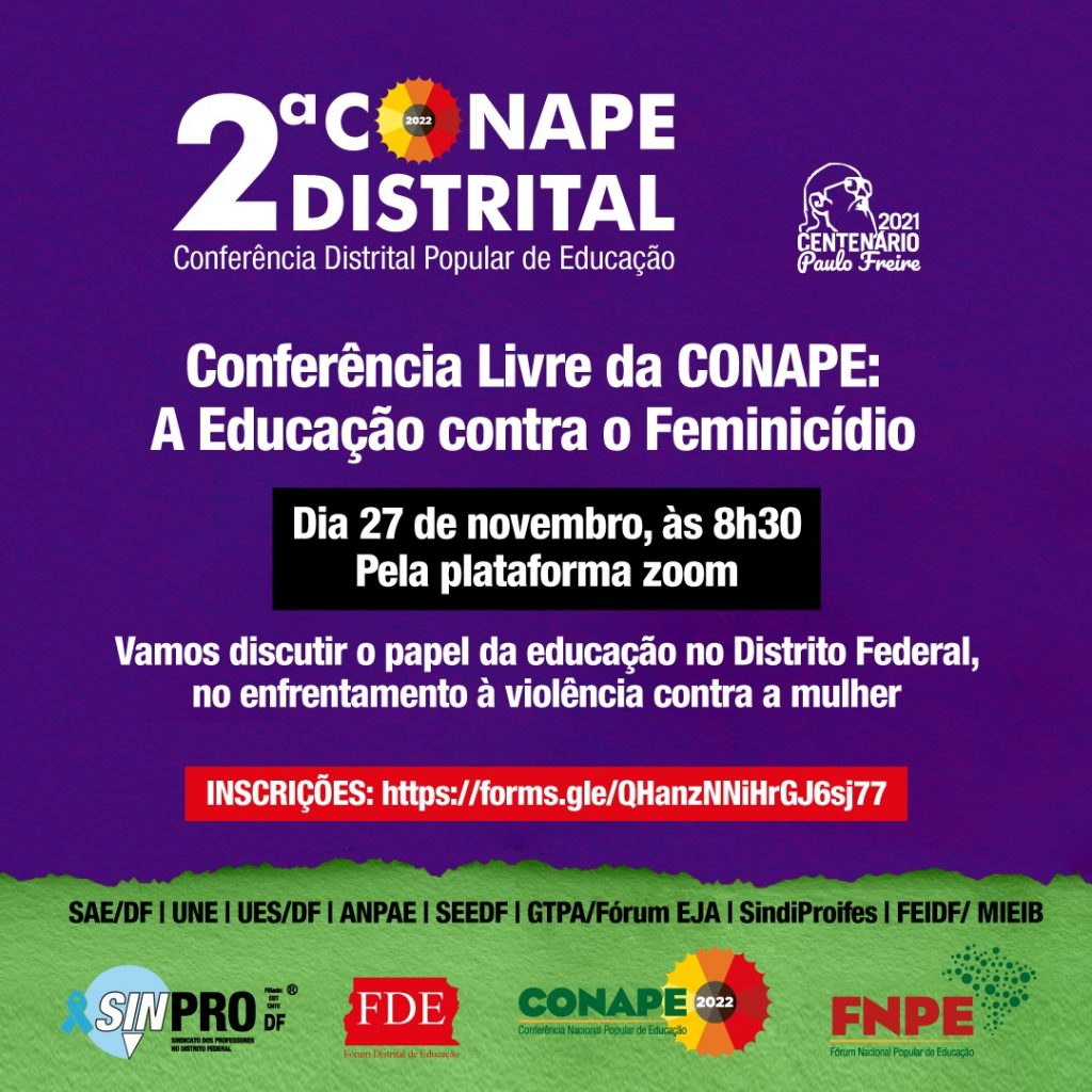O Sinpro convida a comunidade escolar do Distrito Federal a participar da Conferência Livre da 2.ª Conferência Distrital Popular de Educação (Conape), que será realizada no dia 27 de novembro, às 8h30, pela plataforma do Zoom. Trabalhando com o tema A educação contra o feminicídio, a Conferência pretende discutir o papel da educação do Distrito Federal no enfrentamento à violência contra a mulher, um tema necessário e importante.