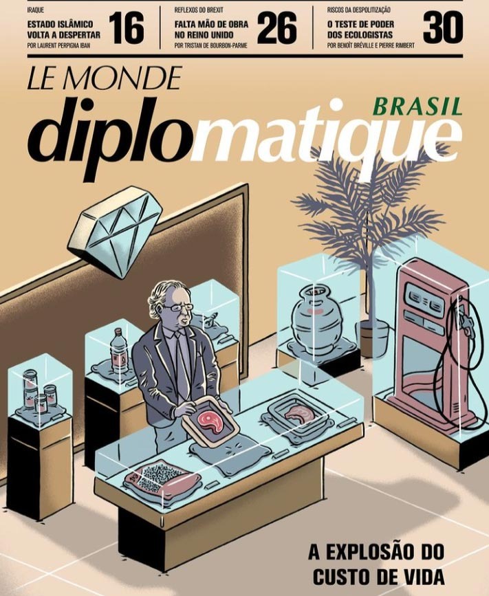 Poderia até passar por uma brincadeira, de mau gosto, claro, mas infelizmente a capa da revista Le Monde Diplomatique Brasil deste mês retrata bem o significado do “custo de vida no país”. De forma caricata, mas ao mesmo tempo explicitamente realista, a revista “expõe na vitrine de Paulo Guedes” alguns produtos que, hoje, estão se tornando inacessíveis para a maioria da população brasileira. E a “exposição” tem aumentado cada vez mais.