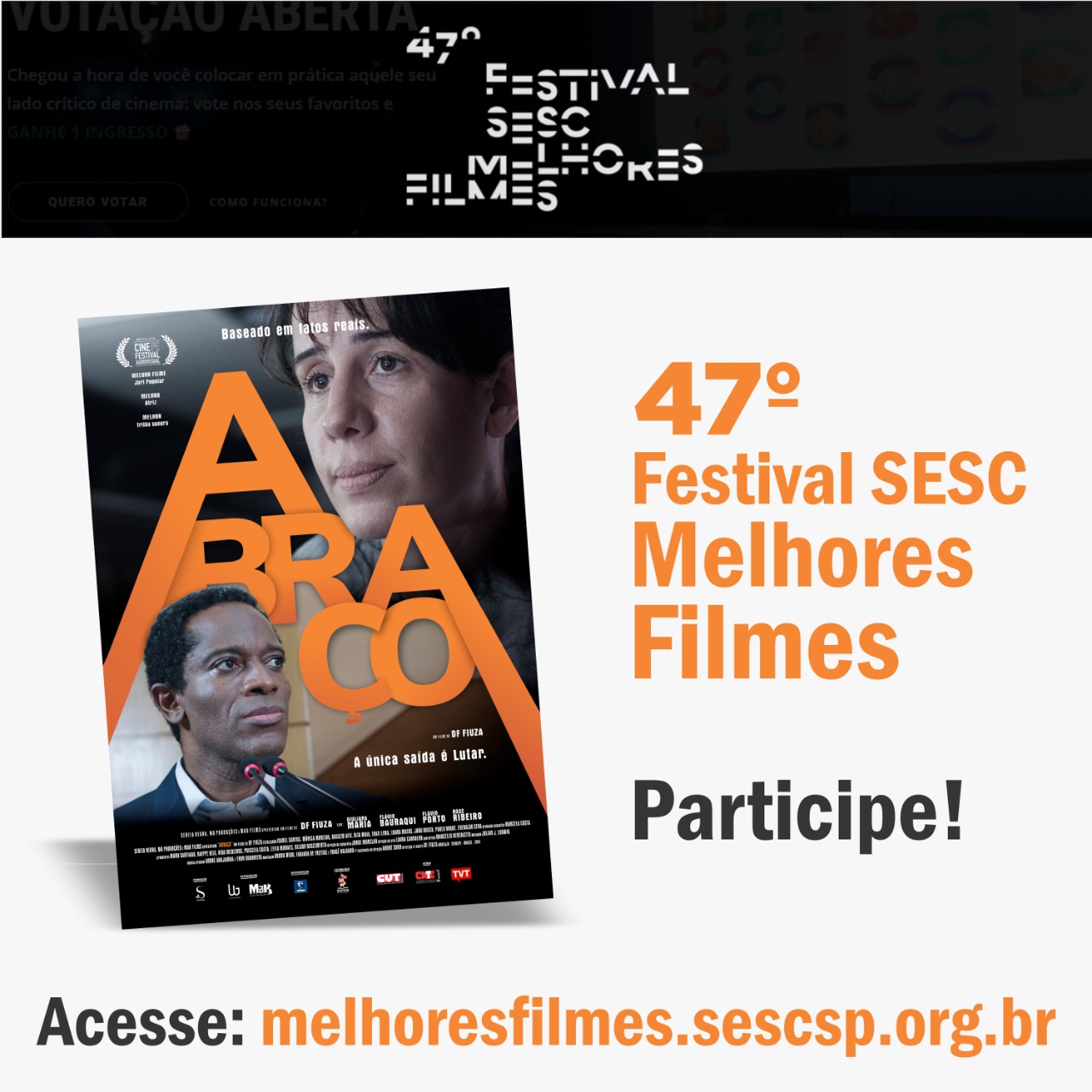 Você pode participar da votação, além de curtir e comentar nas redes sociais. Para votar, basta clicar no link https://melhoresfilmes.sescsp.org.br/votacao/?logado=1. Se você quiser curtir, comentar ou compartilhar, clique no link do Facebook (https://www.facebook.com/188175954536560/posts/3889468581073927/) ou do Instasgram (https://www.instagram.com/p/CLhdokfBoM6/?igshid=3lgilogyolji).