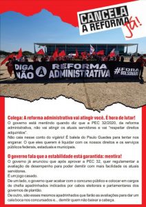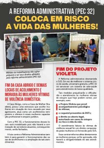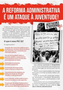 A PEC 32 é um projeto do governo Bolsonaro-Guedes para estancar a atuação do Estado. Utilizando falsos argumentos, como supostos privilégios para servidores e ineficiência do serviço público, o governo federal trabalha para emplacar um dos piores golpes contra a sociedade. Isso porque a reforma Administrativa empurra para a iniciativa privada a prestação de serviços à população. Com isso, o povo, que já padece com a retirada de direitos trabalhistas e a alta no preço do gás, da gasolina, dos alimentos e tantas outras coisas, também poderá passar a pagar por escola, hospital, segurança pública. Além disso, a reforma retira direitos históricos dos servidores públicos das três esferas, como a estabilidade empregatícia, atingindo ativos, aposentados e quem ainda fará parte do funcionalismo.