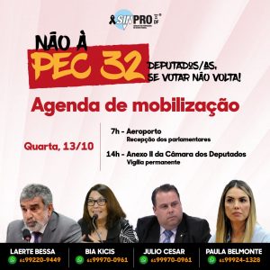 A agenda começa nesta quarta-feira, 13, às 7h, no Aeroporto Internacional de Brasília: vamos dar nosso recado pessoalmente aos parlamentares! Às 14h, vamos todos(as) nos dirigir ao Anexo II da Câmara dos Deputados, onde seguiremos em vigília permanente. Essa é uma ação importante, uma vez que a qualquer momento a PEC 32 pode ser votada pelo plenário da Câmara.