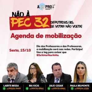 A pressão de cada um de nós é fundamental para que a PEC 32 não seja aprovada. Portanto, acione a plataforma Educação Faz Pressão, exija que os deputados e deputadas votem contra essa reforma administrativa. Precisamos, especialmente, intensificar a pressão sobre os(as) quatro deputados(as) que ainda não apresentaram seus votos: Laerte Bessa; Bia Kicis; Julio Cesar e Paula Belmonte.