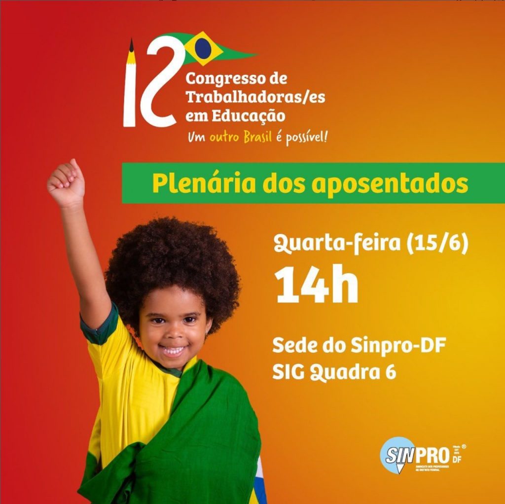 Nesta quarta-feira (15), a Secretaria de Aposentados do Sinpro-DF realiza plenária para eleger delegadas(os) ao 12º Congresso dos Trabalhadores em Educação “Um outro Brasil é possível” (12º CTE). O encontro começa às 14h na sede do Sinpro, no SIG (quadra 6).