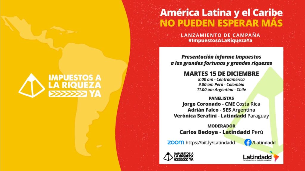 De iniciativa da Rede de Justiça Fiscal da América Latina e Caribe e Rede Latino-americana por Justiça Econômica e Social (Latindadd), a campanha convidou para a live de lançamento da campanha Jorge Coronado, da CNE – Costa Rica; Adrián Falco, da SES Argentina; e Verónica Serafini, da Latindadd – Paraguay. A moderação será feita por Carlos Bedoya, do Latindadd – Peru.
