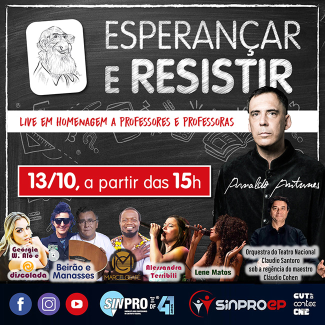 Uma super live cultural homenageará professoras e professores neste 13 de outubro, terça-feira. Como o tema “Esperançar e Resistir”, a atividade que comemora o Dia das/os Professoras/es traz na programação uma série de shows com artistas locais e, como atração principal, o músico, poeta, compositor e artista visual Arnaldo Antunes. A transmissão da live será a partir das 15h, nos canais do Sinpro-DF no Youtube, Facebook e Instagram.