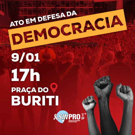 Uma grande manifestação em defesa da democracia acontecerá nesta segunda-feira (09), às 17h, na Praça do Buriti. Chega de terrorismo no DF!
