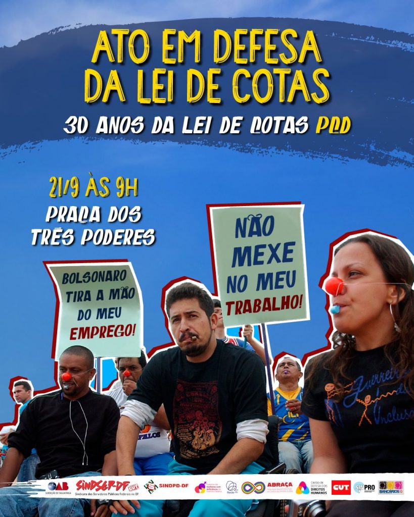 O Sinpro, ao lado de outras entidades parceiras (Coletivo de Mulheres com Deficiência do Distrito Federal, Rede-In, Abraça, Centro DH, Coletivo de Trabalhadores e Trabalhadoras com Deficiência da CUT-DF, Sindicato dos Bancários, Sindsep-DF e OAB Taguatinga), convida todos e todas para o ato em defesa da lei de cotas para pessoas com deficiência, nesta terça-feira, 21. A atividade será uma celebração dos 30 anos da lei, reivindicando sua plena execução.