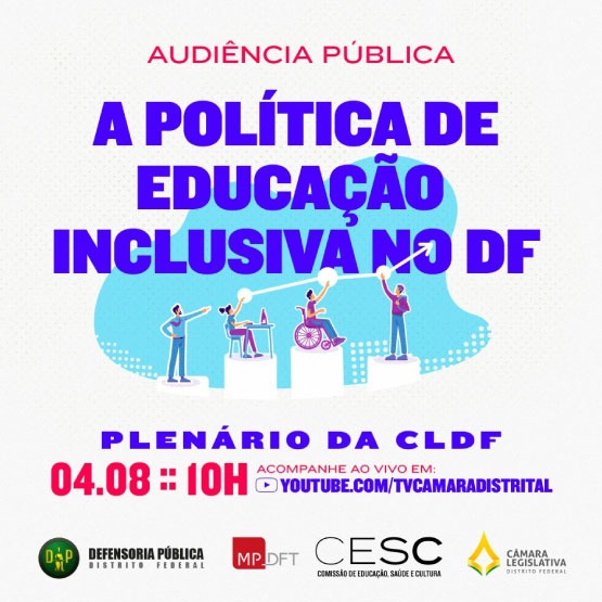 Nesta quinta-feira, 04 de agosto, a Comissão de Educação, Saúde e Cultura da Câmara Legislativa (CESC-CLDF), em parceria com o Ministério Público do DF e a Defensoria Pública do DF, realiza audiência pública com o tema A Política de Educação Inclusiva no DF. O evento acontece às 10h no plenário da CLDF, e terá transmissão ao vivo pelo canal da Câmara no youtube.