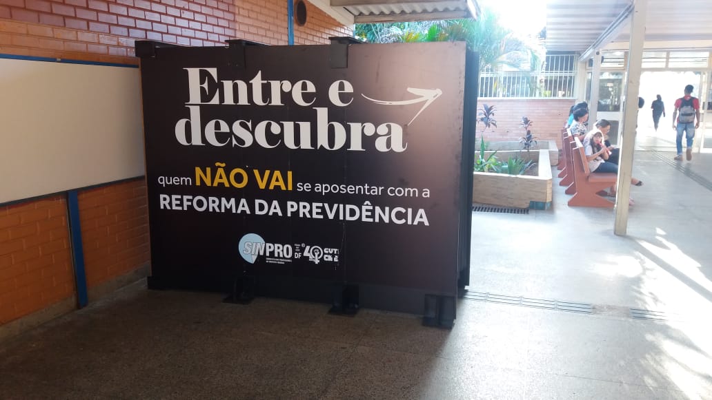 A cabine que aborda a reforma da Previdência foi instalada nessa terça-feira (21) na Escola de Música de Brasília, dando início às visitas do projeto do Sinpro nas escolas públicas do Distrito Federal. Em uma cabine, o cidadão é convidado a entrar para descobrir quem é a pessoa que não vai se aposentar com a reforma de Jair Bolsonaro. Ao passar pela cortina e entrar na cabine, a pessoa se depara com uma pergunta (Quem não vai se aposentar com a reforma da Previdência) e uma porta. Ao abrir, descobre que é ele mesmo que vai ficar sem se aposentar.