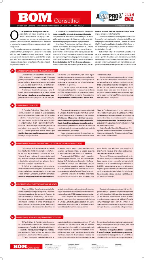 São todos conselhos muito importantes, cujas discussões têm muita relevância para a população do DF! Por isso, a intenção deste boletim é que essas discussões cheguem a cada professora(or) e orientadora(or) educacional nas escolas do DF.