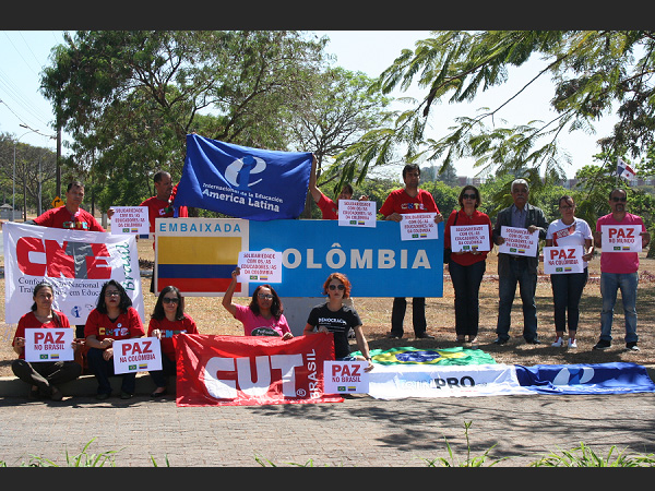Dirigentes da Internacional da Educação (IE), CNTE e Sinpro-DF foram à embaixada da Colômbia, em Brasilia, para pedir paz e segurança aos educadores daquele país. A atividade “Pela vida, pela paz e pela democracia na Colômbia” foi convocada pela IE e está sendo realizada simultaneamente pelas entidades filiadas da America Latina, em solidariedade à FECODE – Federação Colombiana de Educadores e à Associação Sindical de Professores Universitários da Colômbia (ASPU).
