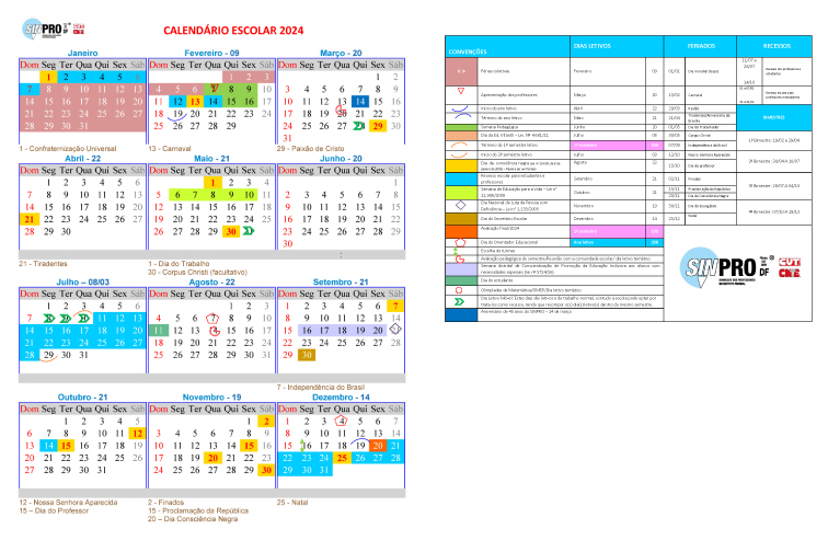 Foi definido o calendário escolar para o ano letivo de 2024. O cronograma tem como referencial enquete realizada pelo Sinpro-DF, que levantou necessidades e preferências da categoria do magistério público do DF quanto aos principais dias do período.
