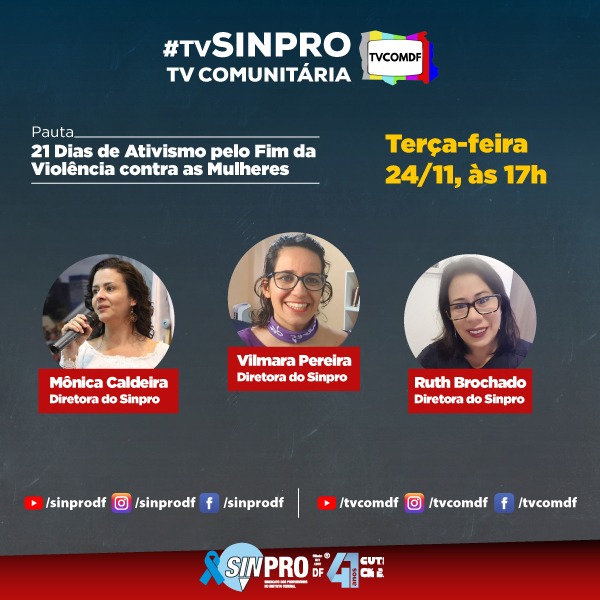 Para marcar a campanha dos 21 Dias de Ativismo pelo Fim da Violência contra as Mulheres, o Sinpro-DF realizará uma série de atividades. Entre elas um bate-papo na TV Sinpro, agendada para terça-feira (24), às 17h. A transmissão é feita pela TV Comunitária (Canal 12 da NET), com retransmissão nas páginas de Facebook, Instagram e Youtube do Sinpro-DF.