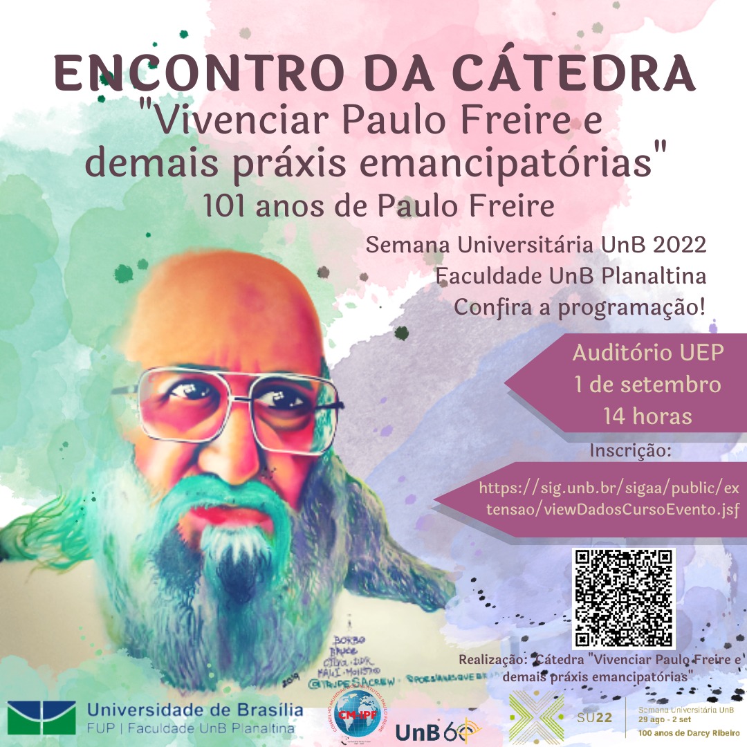 A Cátedra “Vivenciar Paulo Freire e demais práxis emancipatórias” realiza o encontro 101 anos de Paulo Freire, no dia 1º de setembro, às 14h, no auditório da Unidade de Ensino e Pesquisa, da Faculdade UnB Planaltina (UEP-FUP). A atividade faz parte da Semana Universitária UnB 2022, que acontece de 29 de agosto a 02 de setembro. As inscrições podem ser feitas pelo link https://bit.ly/3ebvDXe.