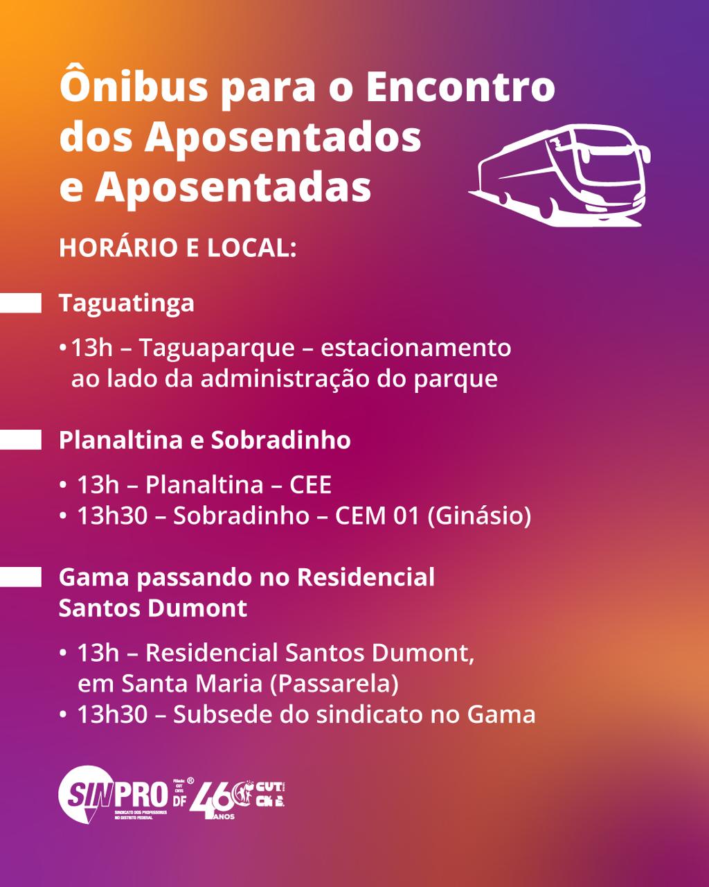 O Sinpro disponibilizará transporte para os(as) participantes do Encontro das Aposentadas e dos Aposentados, a ser realizado nesta quarta-feira (12), a partir das 14h, na sede do Sinpro (SIG). Os ônibus sairão de Taguatinga, Planaltina, Sobradinho e Gama. (Confira locais e horários no fim da matéria).