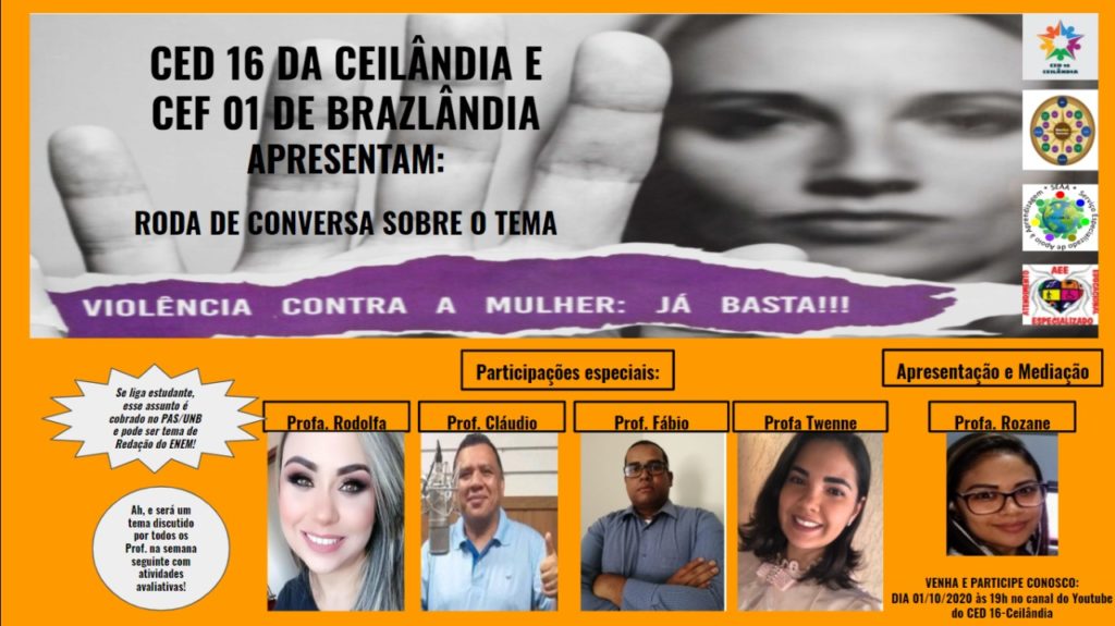 “Violência contra a mulher, já basta!” é o tema da Roda de Conversa desta quinta-feira (1º/10), às 19h, no canal do YouTube do CED 16 de Ceilândia. Na edição desta quinta, o CED 16 se une ao CEF 01 de Brazlândia para discutir a violência contra a mulher.