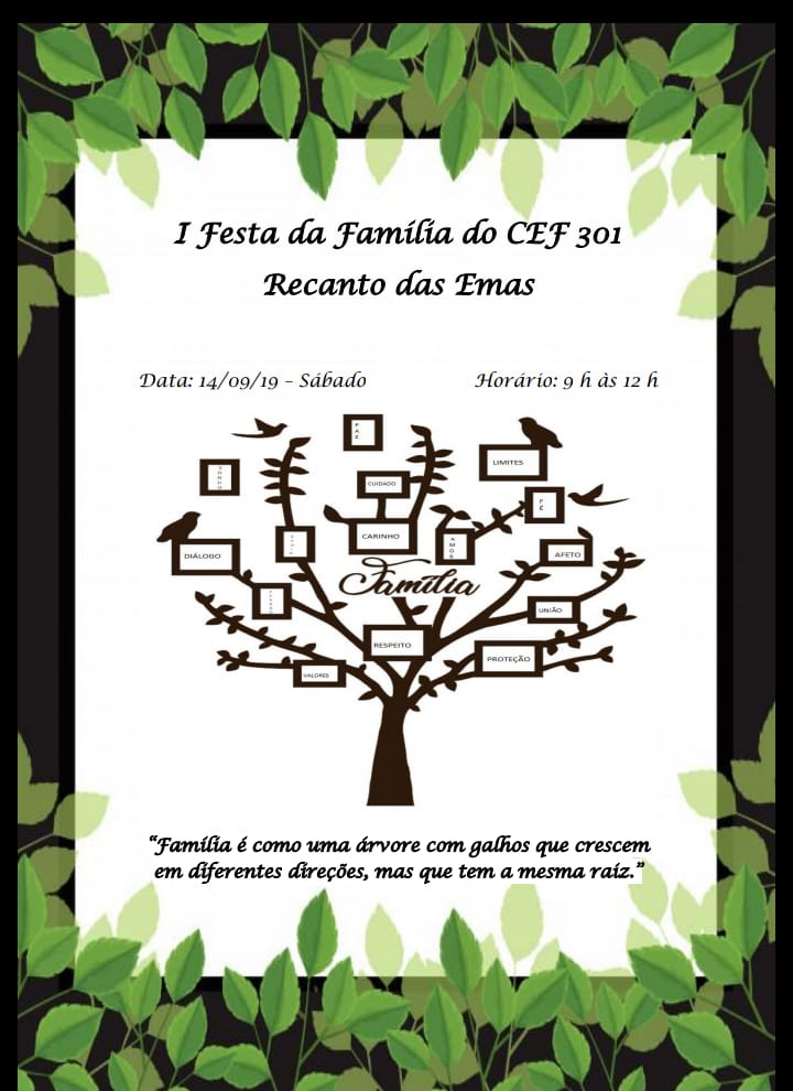 O Centro de Ensino Fundamental (CEF) 301, do Recanto das Emas, convida a todos(as) para sua I Festa da Família. O evento será realizado neste sábado (14), das 9h às 12h. A festa é aberta à comunidade escolar.