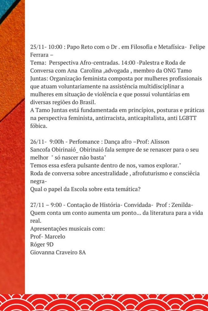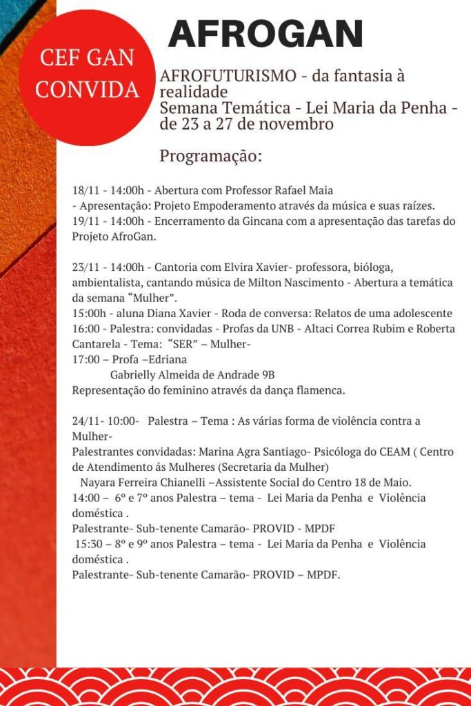 A partir desta quarta-feira (18), o Centro de Ensino Fundamental GAN, na 603 Norte – Plano Piloto, realizará o AFROGAN: Afrofuturismo – da fantasia à realidade. O evento ainda abrange a Semana Temática Maria da Penha, de 23 a 27 de novembro. A atividade, que marca o Mês da Consciência Negra, será aberta ao público. Quem se interessar em participar deverá mandar nome e endereço de email para o WhatsApp 9453-9307. O link será enviado com 30 minutos de antecedência de cada atividade, e a transmissão será feita via Google Meet.