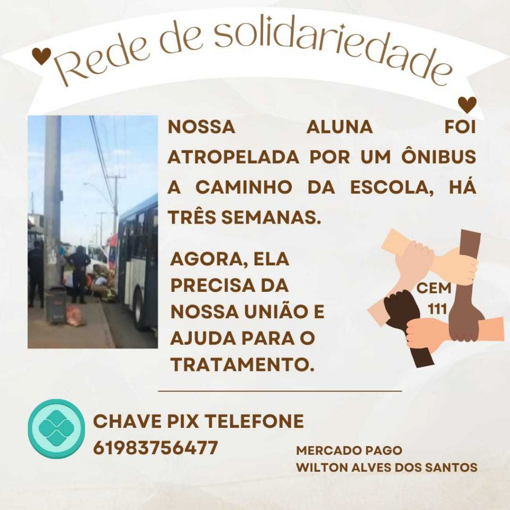 O Centro de Ensino Médio 111 do Recanto das Emas iniciou campanha de arrecadação de verba para custear tratamento a estudante de 15 anos que teve a perna esmagada por um ônibus, a caminho da escola. O tratamento evita que a menina tenha a perna amputada. As doações podem ser realizadas para o PIX de Wilton Alves dos Santos. A chave é o telefone 61 983756477.