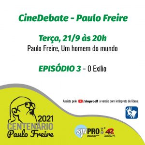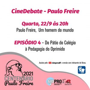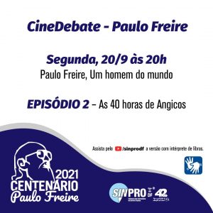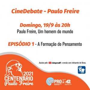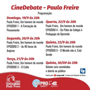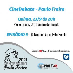 Os eventos emcomemoração ao centenário do legendário Paulo Freire não param. A partir deste domingo, o Sinpro DF traz o Cine Debate Paulo Freire, evento online com transmissão dos cinco episódios da série documental dirigida por Cristiano Burlan, pela primeira vez com versão para Libras, e um debate no dia 30 de setembro.