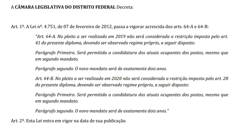A mudança autoriza que as atuais direções participem novamente do pleito em 2019 e ainda  reduz de três para dois anos o mandato de diretores e vices das escolas do DF. O projeto foi aprovado em dois turnos e segue agora para sanção do governador Ibaneis Rocha (MDB). O PL também trata das eleições para conselhos escolares, constituídos por representantes de pais, estudantes, professores e auxiliares. Nesses casos, o processo de escolha passa a utilizar as regras estabelecidas para os diretores e vices. Vale ressaltar que em 2020 a gestão democrática será revisada conforme determina a lei do Plano Distrital de Educação, sendo assim, novas mudanças poderão ocorrer.