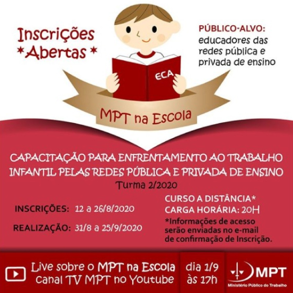 O curso será realizado de 31 de agosto a 25 de setembro (duração de 20 horas), na plataforma EaD do MPT (ead.mpt.mp.br), com live nacional inédita que acontece no dia 1º de setembro, às 17h, pelo canal TVMPT no Youtube. O Projeto MPT na Escola tem por objetivo informar, esclarecer e conscientizar a sociedade, por meio da comunidade escolar, sobre os males do trabalho infantil, bem como acerca dos direitos da criança e do adolescente.