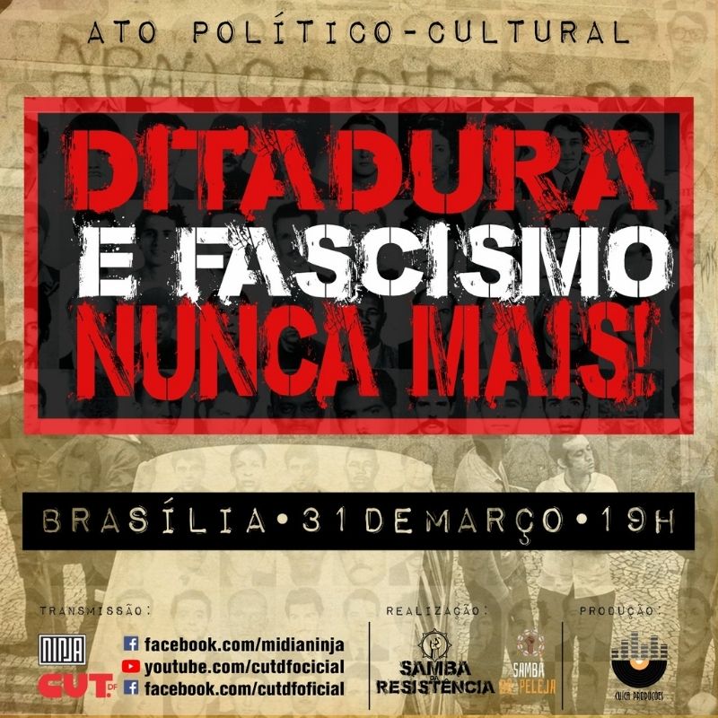 Por ditadura nunca mais, o Samba do Peleja e o coletivo Samba da Resistência realizarão ato político-cultural no próximo dia 31, quarta-feira, 57 anos depois do golpe militar que interrompeu o governo do presidente democraticamente eleito Jango. A ação será virtual, a partir das 19, com transmissão pela página do Sinpro-DF no Facebook (https://www.facebook.com/sinprodf), no Facebook do Midia Ninja (www.facebook.com/midianinja), no canal oficial da CUT-DF no YouTube (https://www.youtube.com/cutdfoficial ) e também no Facebook da Central (https://www.facebook.com/cutdfoficial)