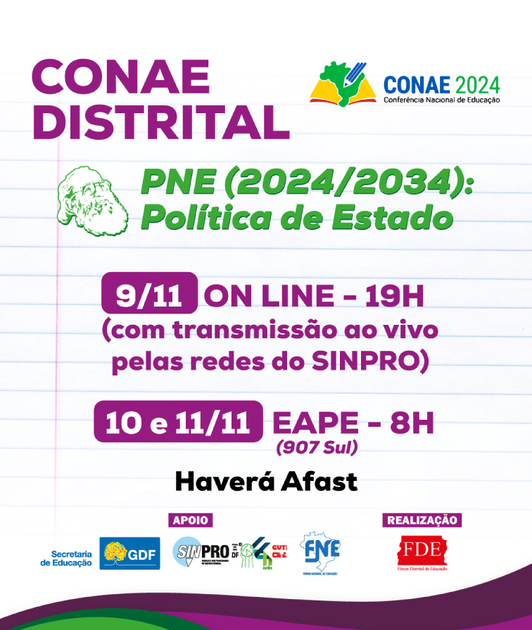 O Fórum Distrital de Educação (FDE), o Sinpro-DF e todas as entidades parceiras, mobilizadas na realização da Conferência Nacional de Educação 2024 – Etapa Distrital (Conae Distrital), convidam a todos(as) para a Conae Distrital, a ser realizada nos dias 9, 10 e 11 de novembro, na EAPE, 907 Sul. O Sinpro informa que haverá AFAST.