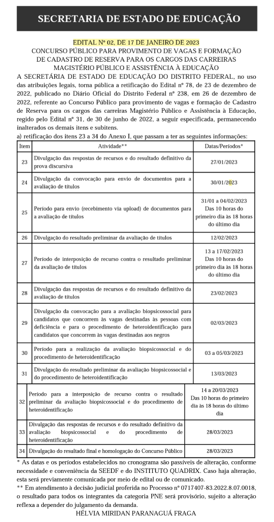 O Diário Oficial do dia 17 de janeiro (à página 42) divulgou retificação do edital do concurso público do magistério público do Distrito Federal. Foram retificados os itens 23 a 34 do Anexo I, que alteram as datas-limite das etapas do concurso. (confira no print abaixo as novas datas).