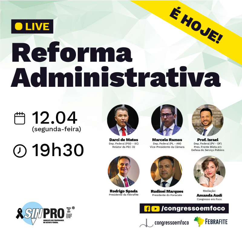 O Congresso em Foco realiza, às 19h30 dessa segunda-feira (12), uma Live com o tema Reforma Administrativa. A atividade tem a parceria da Febrafite e contará com a presença dos deputados Darci de Matos, Marcelo Ramos e Professor Israel, além do presidente da Febrafite, Rodrigo Spada, e do presidente da Fonacate, Rudinei Marques.