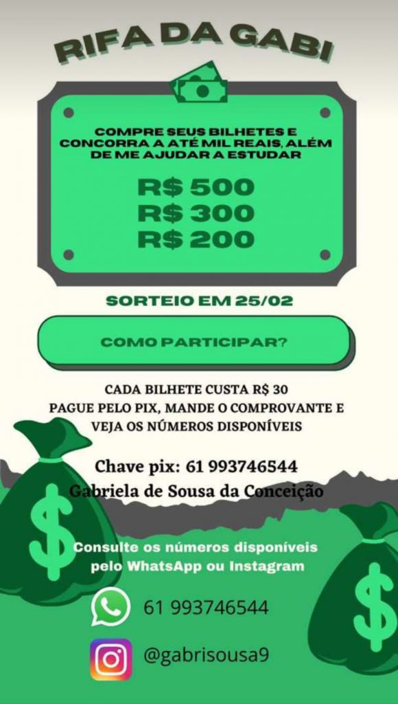 O sorteio será dia 25 de fevereiro. Aquele e aquela que quiser participar deve efetuar um pix para a chave-pix (61)99374-6544 (celular), e enviar o comprovante para o mesmo número (whatsapp). Por esse meio também serão escolhidos o(s) número(s) para participar do sorteio.
