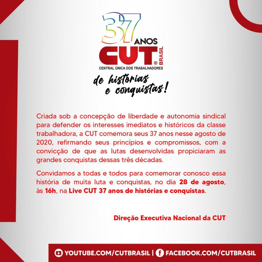 O Sinpro-DF se une à CUT para comemorar seus 37 anos e reafirmar os seus princípios e compromissos e convida a categoria para a festa virtual, nesta sexta-feira (28), às 16h, pela live “CUT: 37 anos de histórias e conquistas”.