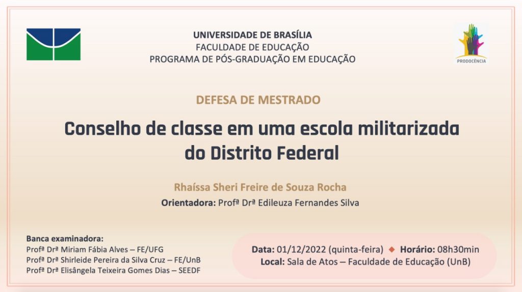 Dia 1º de dezembro, quinta-feira, a professora Rhaíssa Sheri Freire de Souza Rocha defenderá sua dissertação de mestrado a partir de 8h30 na Sala de Atos da Faculdade de Educação da UnB (FE/UnB). O tema da dissertação é atualíssimo: “Conselho de classe em uma escola militarizada do DF”.