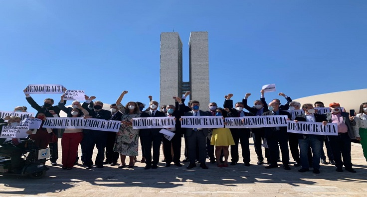 Parlamentares foram para a frente do Congresso Nacional se manifestarem contra as ameaças à democracia