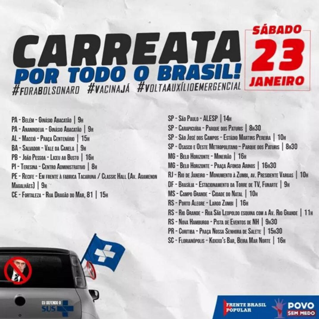 “Mesmo com mais de 210 mil mortos, Bolsonaro segue negando a gravidade da pandemia e se colocado até contra a vacina, agindo para tirar recursos do SUS, atuando para não aprovar a Coronavac. Em meio a crise da falta de oxigênio de Manaus, não fez absolutamente nada”, afirmam as Frentes Brasil Popular e Povo Sem Medo para o site da CUT Brasil.