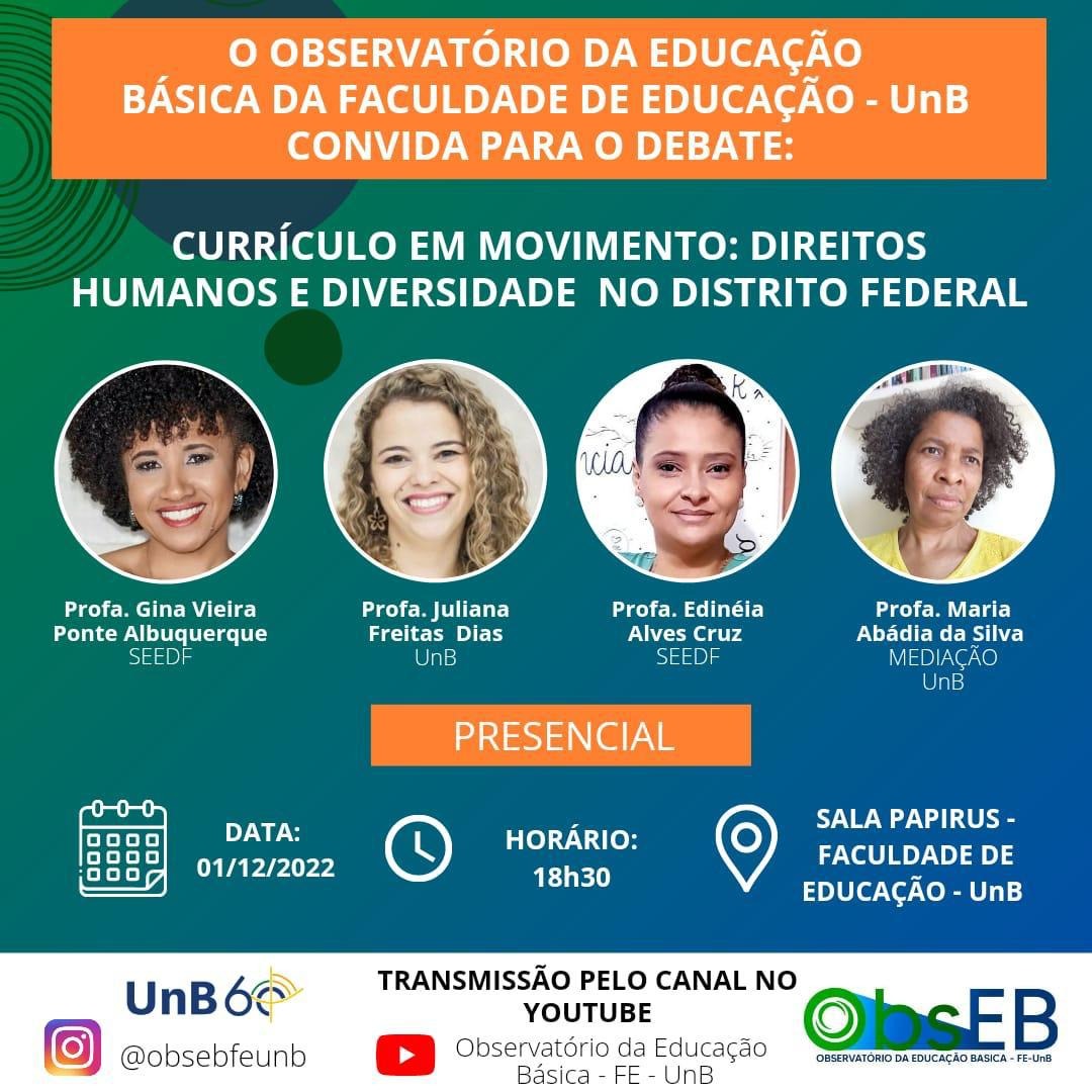 O Observatório da Educação Básica da Faculdade de Educação da Universidade de Brasília (ObsEB/UnB) debate, no dia 1º de dezembro, às 18h30, o tema: Currículo em Movimento: Direitos Humanos e Diversidade no Distrito Federal. O debate contará com a participação das professoras Gina Vieira Albuquerque, da Secretaria de Educação do DF (SEEDF); Juliana Freitas Dias, da Universidade de Brasília (UnB); e Edneia Alves Cruz, também da SEEDF. A mediação ficará sob a responsabilidade da professora Maria Abadia da Silva, da UnB.