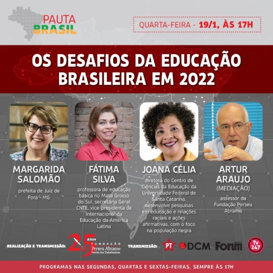 Os desafios da educação brasileira em 2022 é tema do Pauta Brasil, nesta quarta-feira (19/01). O programa da Fundação Perseu Abramo, que recebe especialistas, lideranças políticas e gestores públicos para discutir os grandes temas da conjuntura política brasileira, terá dessa vez a participação da secretária geral da CNTE e vice-presidenta da Internacional da Educação da América Latina, Fátima Silva. O programa poderá ser acompanhado ao vivo pelo canal da Fundação Perseu Abramo no YouTube, na página no Facebook e perfil no Twitter, a partir das 17h. DCM TV, Revista Fórum, TV 247 e redes sociais do Partido dos Trabalhadores retransmitem o Pauta Brasil.