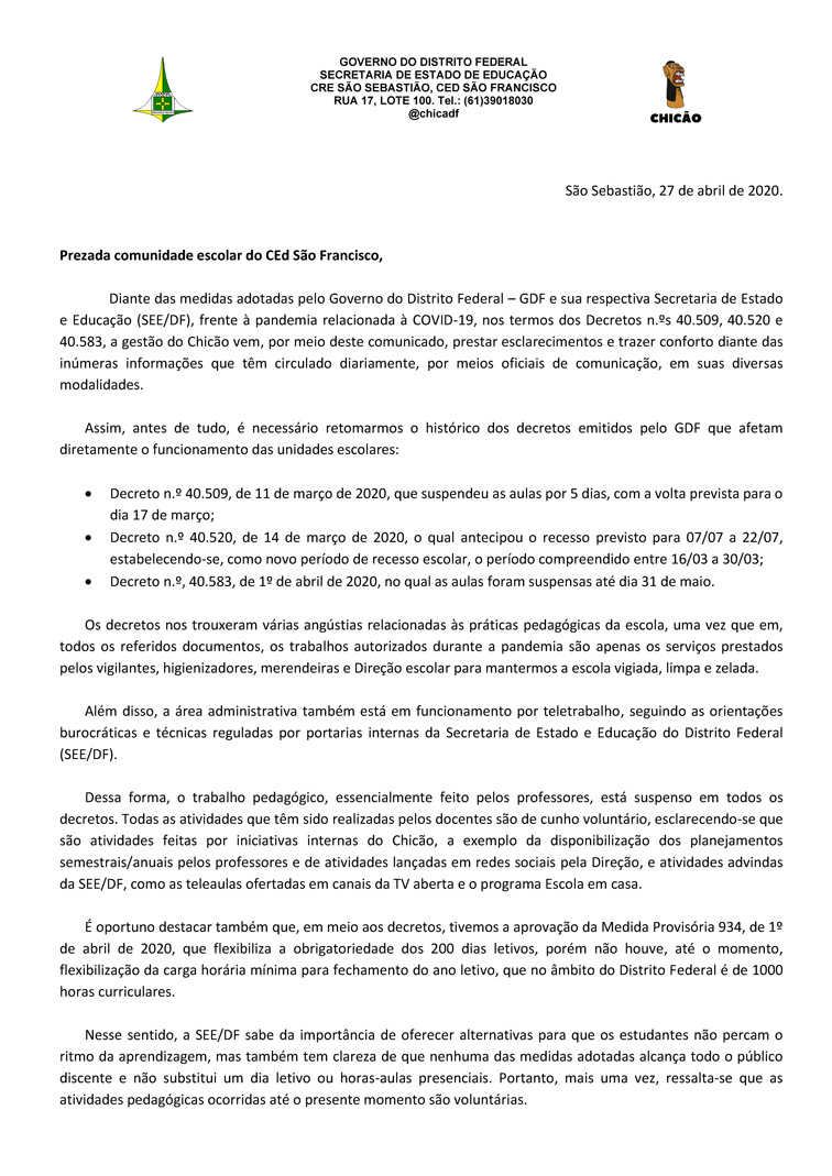 Pensando nisso e num suposto calendário de volta às aulas do governo Ibaneis Rocha (MDB), os diretores de escolas e gestores das Coordenações Regionais de Ensino do Distrito Federal (CRE) da rede pública de educação do DF decidiram enviar cartas às mães, pais e responsáveis pelos estudantes para explicar a situação, pedir apoio ao isolamento e retorno das escolas somente em um momento seguro.