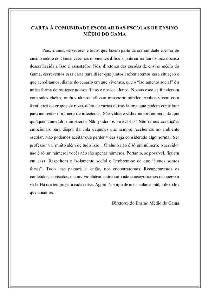 Confira, a seguir, a carta dos diretores do Gama à comunidade escolar: