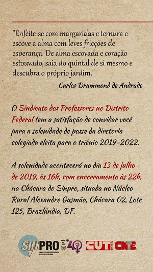 A diretoria colegiada eleita para o triênio (2019-2022) tomará posse neste sábado (13), na Chácara do Sinpro, localizada no Núcleo Rural Alexandre Gusmão, em Brazlândia. A cerimônia começará às 16h e se encerra às 22h. Toda a categoria está convidada a prestigiar a solenidade.