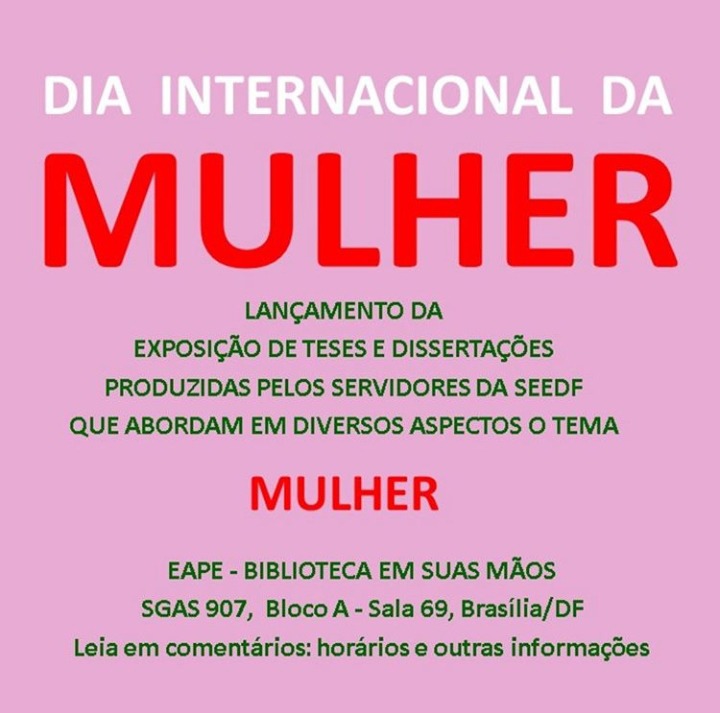 No Dia Internacional da Mulher, a Biblioteca da EAPE faz o lançamento da exposição de teses e dissertações produzidas pelas Mulheres da Educação. O evento aborda em diversos aspectos o tema Mulher e acontece no dia 8 de março, das 6h às 20h, na EAPE (SGAS 907, Bloco A – Sala 69). E do dia 11/03 a 29/03 a exposição está aberta ao público, das 9h às 12h e 14h às 17h.