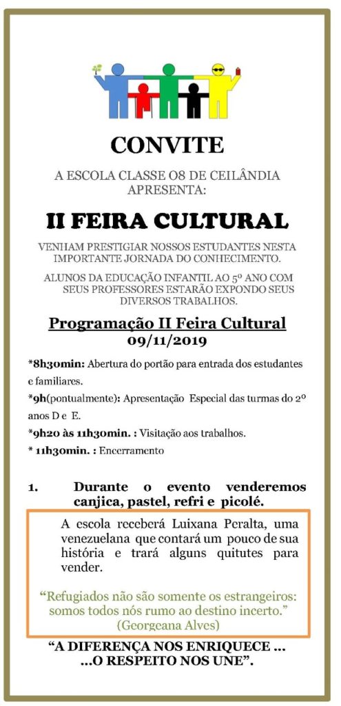 A atividade também contará com a presença da venezuelana Luixana Peralta, que contará sua trajetória de vida e aproveitará a oportunidade para vender alguns quitutes. Não perca!