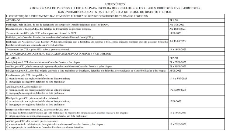 Foi publicado no Diário Oficial do DF (DODF) desta segunda-feira, 07, o edital nº 12, que torna pública a realização da eleição direta de conselheiros escolares, diretores(as) e vice-diretores(as) das Unidades Escolares na Rede Pública de Ensino do Distrito Federal. O edital também publica o cronograma do processo eleitoral (veja no final do texto).