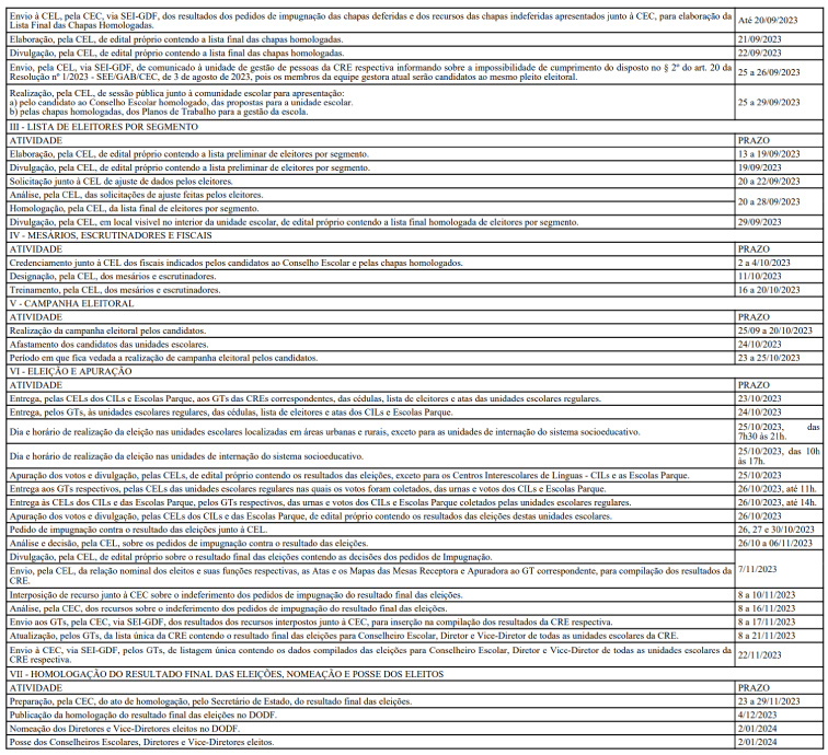 A inscrição das chapas e dos candidatos ao conselho escolar deve acontecer entre os dias 21 e 25 de agosto. O período destinado à campanha eleitoral é de 25 de setembro a 20 de outubro, e as eleições ocorrem em 25 de outubro.